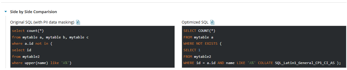 Optimized SQL: DPA shows a side-by-side comparison between the original and optimized SQL text