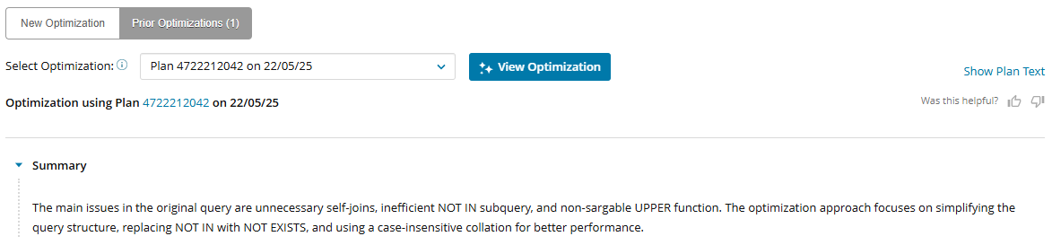 Click the “Optimize SQL for Plan” button. This submits the optimization request to SolarWinds AI, and can take a few seconds to a couple of minutes to complete, which mostly depends on the complexity of the query.