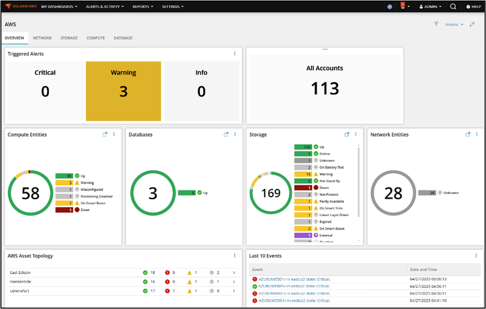 SolarWinds Observability Self-Hosted provides a single pane of glass for monitoring a wide range of AWS services, enabling IT teams to gain visibility over key areas such as compute, network, storage, and databases for their AWS cloud infrastructure alongside their on-premises networks and systems. Specific AWS services that can be monitored include Amazon Elastic Compute Cloud (EC2), Amazon Relational Database Service (RDS), Amazon Simple Storage Service (S3), and more. This unified visibility simplifies management and enhances operational efficiency by consolidating data from various sources into a cohesive view.