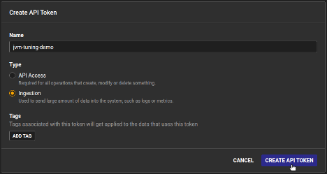Specify a name for your new API token. Select Ingestion as the token type. You can also add tags if you wish. Click Create API Token.