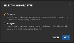 You can create custom dashboards to visualize multiple metrics side by side or overlaid on top of one another to get more value for your telemetry data. On the Dashboards page, click Create Dashboard. Select the Standard dashboard type and click Next.
