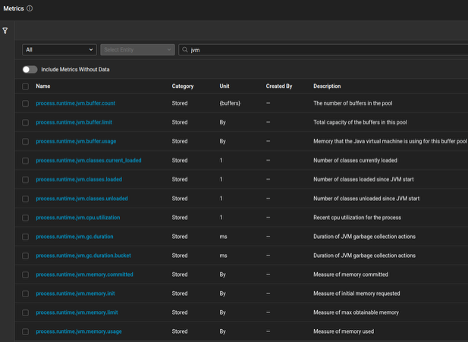 On the Metrics page, search for metrics related to JVM. This returns a substantial list of metrics captured by your application.
