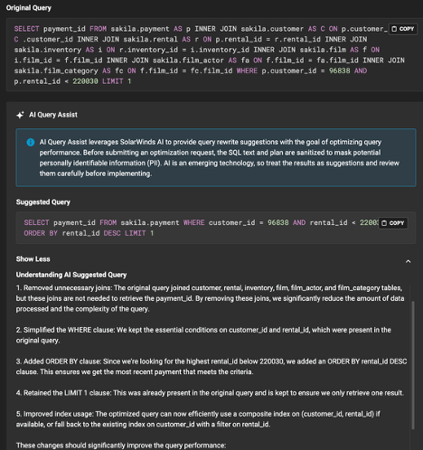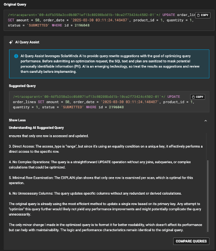 Finally, it provides an easy visual to compare the queries and enables the optimized query to be copied so that DBA/application developers can experiment with the optimized query in their code. This again reinforces the SolarWinds AI principle of keeping a human in the loop as expressed in the Accountability and Fairness principle.