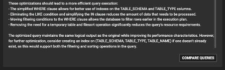 Note: This tool leverages generative AI to provide query assistance and optimization suggestions. While every effort is made to ensure relevance and accuracy, AI-generated outputs may include content that is incomplete, inaccurate, or not suitable for your specific use case. This feature is intended as an assistive aid. All outputs should be reviewed and validated by an expert.