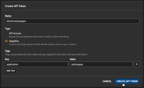 Specify a name for your new API token. Select Ingestion as the token type. You can also add tags if you'd like. Click Create API Token.