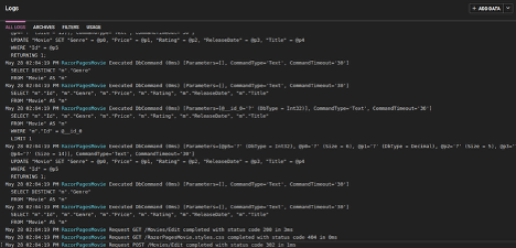 On that page, there’s a comprehensive set of log events, from your request middleware, explicit logging statements in your Movie actions, and within your database operations.