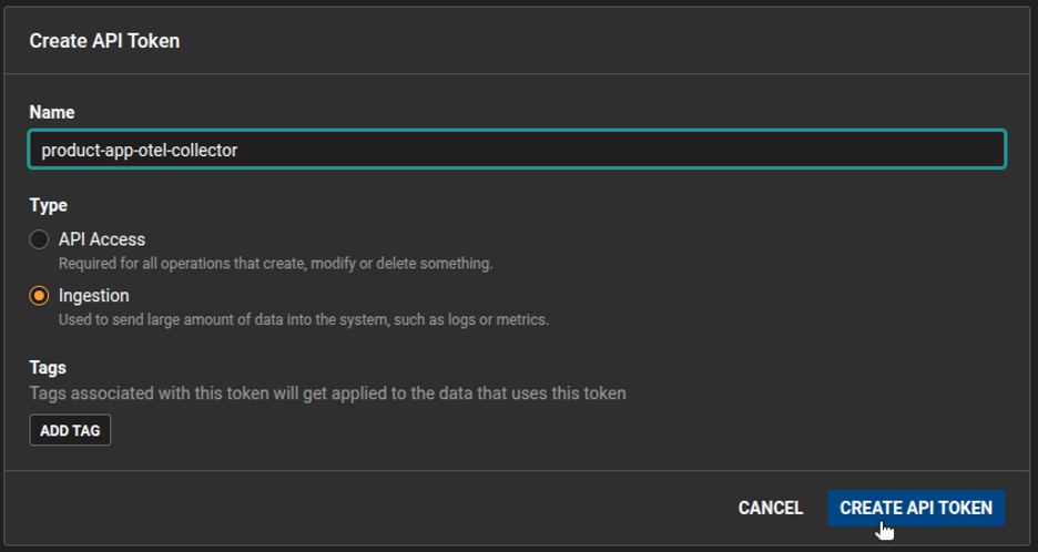 Specify a name for your new API token. Select Ingestion as the token type. You can also add tags if you wish. Click Create API Token.