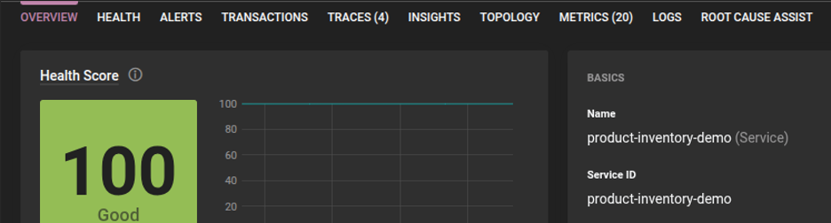 When you click on the application, you can see from the tab bar that there are associated traces, metrics, and logs.