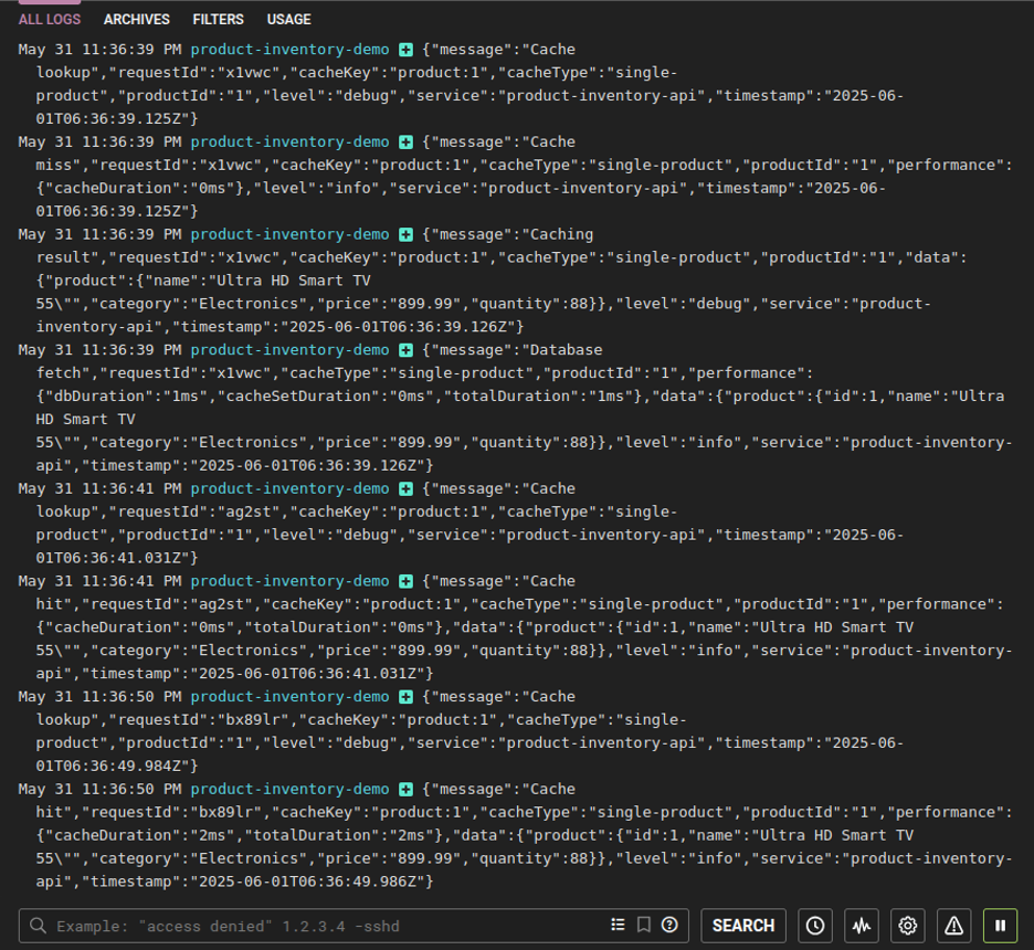 <span style="font-weight:400;">const</span><span style="font-weight:400;"> winston = </span><span style="font-weight:400;">require</span><span style="font-weight:400;">(</span><span style="font-weight:400;">'winston'</span><span style="font-weight:400;">);</span><span style="font-weight:400;"><br /></span><span style="font-weight:400;">const</span><span style="font-weight:400;"> { LoggerProvider, SimpleLogRecordProcessor } = </span><span style="font-weight:400;">require</span><span style="font-weight:400;">(</span><span style="font-weight:400;">'@opentelemetry/sdk-logs'</span><span style="font-weight:400;">);</span><span style="font-weight:400;"><br /></span><span style="font-weight:400;">const</span><span style="font-weight:400;"> { OTLPLogExporter } = </span><span style="font-weight:400;">require</span><span style="font-weight:400;">(</span><span style="font-weight:400;">'@opentelemetry/exporter-logs-otlp-http'</span><span style="font-weight:400;">);</span><span style="font-weight:400;"><br /></span><span style="font-weight:400;">const</span><span style="font-weight:400;"> { Resource } = </span><span style="font-weight:400;">require</span><span style="font-weight:400;">(</span><span style="font-weight:400;">'@opentelemetry/resources'</span><span style="font-weight:400;">);</span><span style="font-weight:400;"><br /></span><span style="font-weight:400;">const</span><span style="font-weight:400;"> { SemanticResourceAttributes } = </span><span style="font-weight:400;">require</span><span style="font-weight:400;">(</span><span style="font-weight:400;">'@opentelemetry/semantic-conventions'</span><span style="font-weight:400;">);</span><span style="font-weight:400;"><br /></span><span style="font-weight:400;"><br /></span><span style="font-weight:400;">// Create OpenTelemetry LoggerProvider</span><span style="font-weight:400;"><br /></span><span style="font-weight:400;">const</span><span style="font-weight:400;"> loggerProvider = </span><span style="font-weight:400;">new</span><span style="font-weight:400;"> LoggerProvider({</span><span style="font-weight:400;"><br /></span><span style="font-weight:400;"> </span><span style="font-weight:400;">resource</span><span style="font-weight:400;">: </span><span style="font-weight:400;">new</span><span style="font-weight:400;"> Resource({</span><span style="font-weight:400;"><br /></span><span style="font-weight:400;"> [SemanticResourceAttributes.SERVICE_NAME]: </span><span style="font-weight:400;">'product-inventory-api'</span><span style="font-weight:400;">,</span><span style="font-weight:400;"><br /></span><span style="font-weight:400;"> [SemanticResourceAttributes.SERVICE_VERSION]: </span><span style="font-weight:400;">'1.0.0'</span><span style="font-weight:400;">,</span><span style="font-weight:400;"><br /></span><span style="font-weight:400;"> [SemanticResourceAttributes.DEPLOYMENT_ENVIRONMENT]: process.env.NODE_ENV || </span><span style="font-weight:400;">'development'</span><span style="font-weight:400;"><br /></span><span style="font-weight:400;"> }),</span><span style="font-weight:400;"><br /></span><span style="font-weight:400;">});</span><span style="font-weight:400;"><br /></span><span style="font-weight:400;"><br /></span><span style="font-weight:400;">// Create OTLP Log Exporter</span><span style="font-weight:400;"><br /></span><span style="font-weight:400;">const</span><span style="font-weight:400;"> logExporter = </span><span style="font-weight:400;">new</span><span style="font-weight:400;"> OTLPLogExporter({</span><span style="font-weight:400;"><br /></span><span style="font-weight:400;"> </span><span style="font-weight:400;">url</span><span style="font-weight:400;">: process.env.OTEL_EXPORTER_OTLP_ENDPOINT + </span><span style="font-weight:400;">'/v1/logs'</span><span style="font-weight:400;">,</span><span style="font-weight:400;"><br /></span><span style="font-weight:400;"> </span><span style="font-weight:400;">headers</span><span style="font-weight:400;">: {</span><span style="font-weight:400;"><br /></span><span style="font-weight:400;"> </span><span style="font-weight:400;">'Authorization'</span><span style="font-weight:400;">: </span><span style="font-weight:400;">`Bearer </span><span style="font-weight:400;">${process.env.API_TOKEN}</span><span style="font-weight:400;">`</span><span style="font-weight:400;"><br /></span><span style="font-weight:400;"> }</span><span style="font-weight:400;"><br /></span><span style="font-weight:400;">});</span><span style="font-weight:400;"><br /></span><span style="font-weight:400;"><br /></span><span style="font-weight:400;">// Add the log processor to the logger provider</span><span style="font-weight:400;"><br /></span><span style="font-weight:400;">loggerProvider.addLogRecordProcessor(</span><span style="font-weight:400;"><br /></span><span style="font-weight:400;"> </span><span style="font-weight:400;">new</span><span style="font-weight:400;"> SimpleLogRecordProcessor(logExporter)</span><span style="font-weight:400;"><br /></span><span style="font-weight:400;">);</span><span style="font-weight:400;"><br /></span><span style="font-weight:400;"><br /></span><span style="font-weight:400;">// Get the OpenTelemetry logger</span><span style="font-weight:400;"><br /></span><span style="font-weight:400;">const</span><span style="font-weight:400;"> otelLogger = loggerProvider.getLogger(</span><span style="font-weight:400;">'product-inventory-api'</span><span style="font-weight:400;">);</span><span style="font-weight:400;"><br /></span><span style="font-weight:400;"><br /></span><span style="font-weight:400;">// Create Winston logger for console output</span><span style="font-weight:400;"><br /></span><span style="font-weight:400;">const</span><span style="font-weight:400;"> winstonLogger = winston.createLogger({</span><span style="font-weight:400;"><br /></span><span style="font-weight:400;"> </span><span style="font-weight:400;">level</span><span style="font-weight:400;">: process.env.LOG_LEVEL |