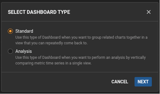 You can create custom dashboards to visualize multiple metrics for correlation and better understanding of your telemetry data. On the Dashboards page, click Create Dashboard. Select the Standard dashboard type and click Next.