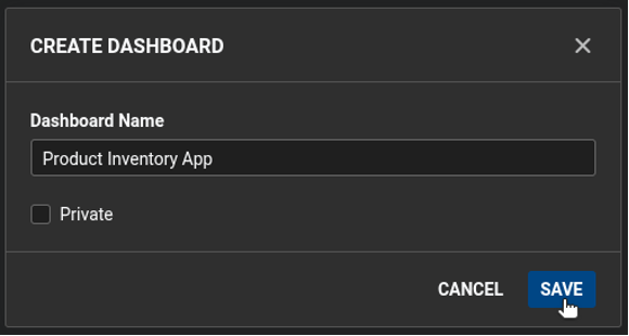 An empty dashboard will be created. Click Save. Specify a dashboard name, and then click Save again.