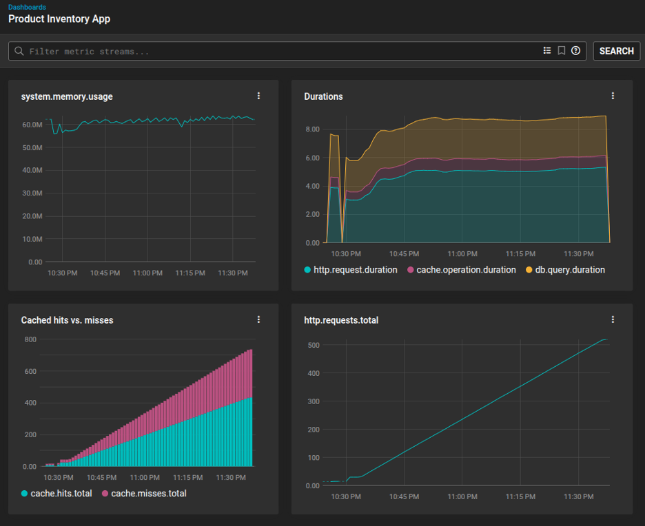 This will show your custom metrics, any metrics from trace auto instrumentation, and SolarWinds Observability SaaS platform metrics.