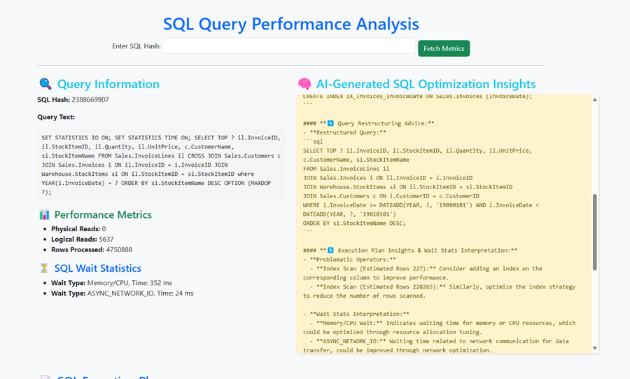 Once this information is collected, I pass the query text, execution plan, wait statistics, and row processing metrics to OpenAI for further interpretation.