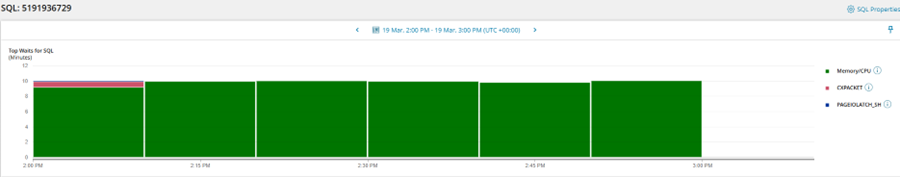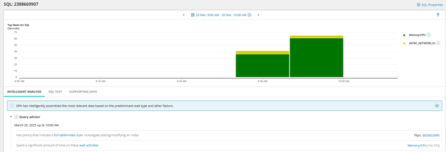 SolarWinds DPA successfully captures all key performance details related to this query—execution plan, I/O statistics, and wait events—providing a rich dataset for analysis.