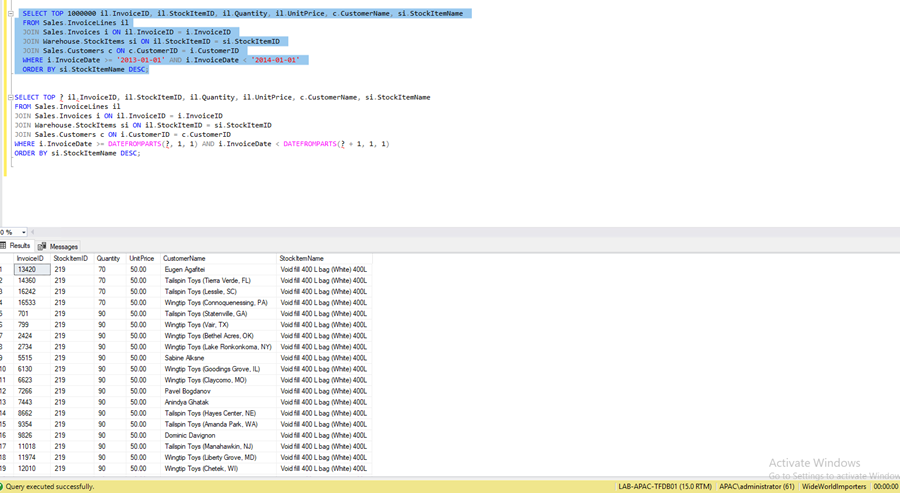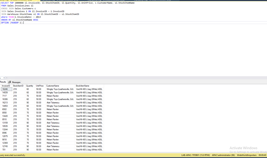 SELECT TOP 1000000 il.InvoiceID, il.StockItemID, il.Quantity, il.UnitPrice, c.CustomerName, si.StockItemName