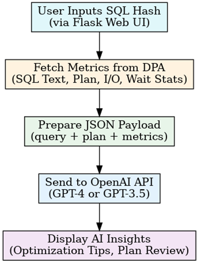 Once the SQL metrics and execution plan are gathered, the app structures them into a JSON object and sends it to OpenAI’s GPT API (GPT-3.5 or GPT-4, depending on your setup).