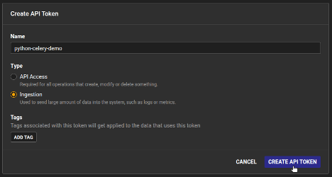 Specify a name for your new API token. Select Ingestion as the token type. Click Create API Token.