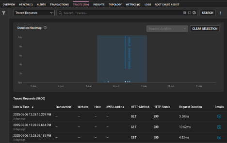 Click on the Traces tab. API request traces are shown across the various runs of the demo script.