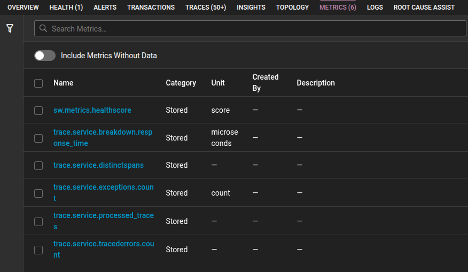 Clicking on the listed application will show the presence of captured traces, metrics, and logs, available in the sub-navigation of tabs at the top of the page.