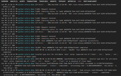 With OpenTelemetry configured to export telemetry data to SolarWinds Observability SaaS, and the application properly instrumented, start up the application and the Celery task queue process. Then, run the demo script.