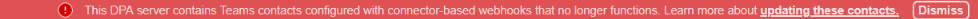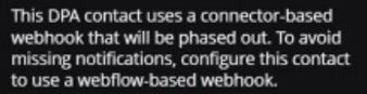DPA now supports both the interim connector-based webhook as well as the new webflow-based webhook, and provides in-product messaging if you have configured Contacts with either the interim or legacy webhook. DPA's REST API has also been updated to return in error if attempting to assign a legacy webhook to a contact.