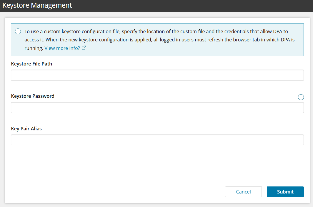 DPA now includes a keystore management page that enables you to connect to DPA with a custom, encrypted SSL certificate. On the Options page, administrators can use the Keystore Management link to specify the location of the custom keystore containing a certificate and keystore password.