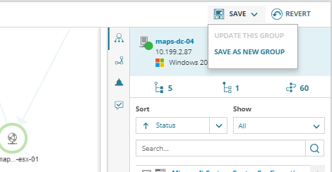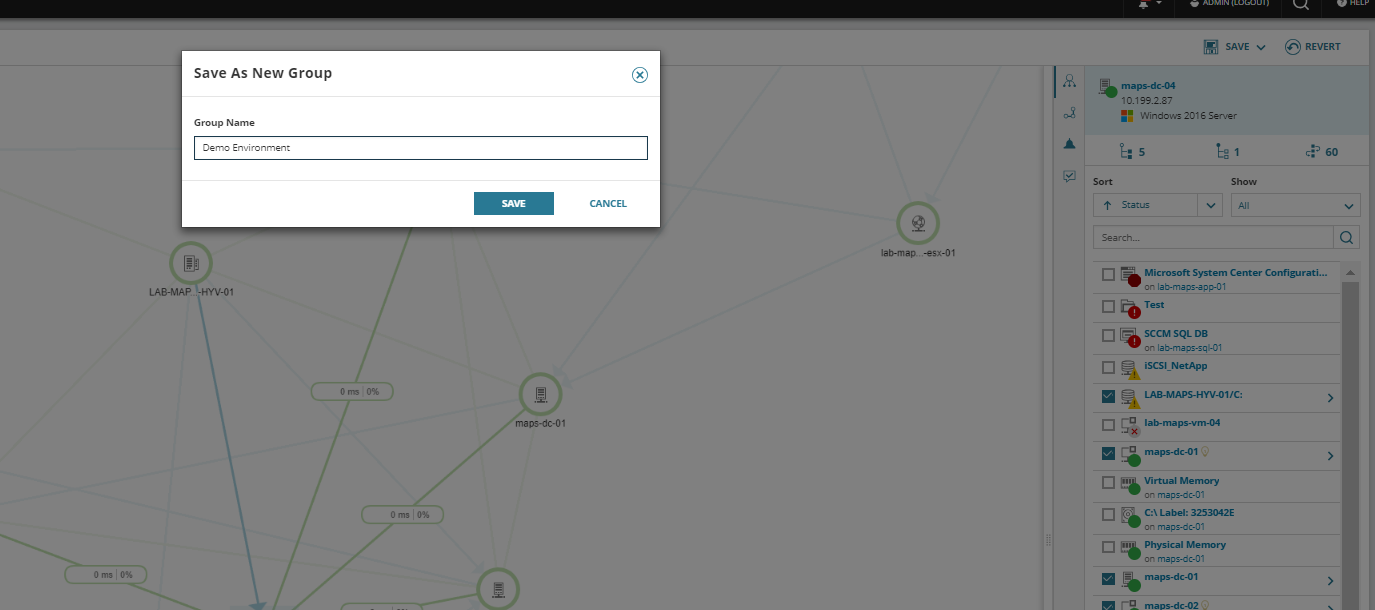 Since I have been able to modify this map to include all the objects I care about, ideally I still want to be able to save it, run reports on availability, and of course alert when issues occur. The best way to do this in Orion today is leveraging groups. Luckily, we have built in an option that allows you to take all of the data you have in the map, and create a group with a couple clicks. Up in the right hand corner of the tool, there is a quick 'save' option.