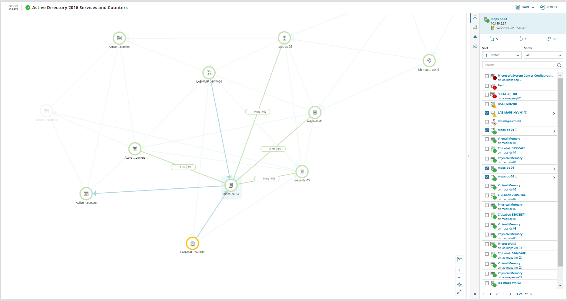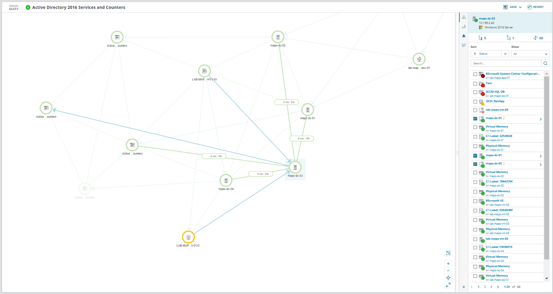 As you can see, in this release I can move objects around the canvas, which i demonstrate briefly above. This allows me to gain visibility in crowded maps, but please note, these changes will not persist for the map. I am now left with the AD applications as part of the map, the AD servers, and the associated infrastructure. Maps-dc-01 and maps-dc-02 appear to live on lab-maps-esx-01 and also depend on datastore1.