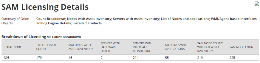 This is going to sound like a silly question? the SAM node output part of this report states for me I have 219 SAM Nodes. I'm using component monitoring AL1100 and i've nearly reached 1100 components. I'm thinking that to upgrade to AL1500 would be the best option because the upgrade path to SAM node licensing from AL1100 to SAM100 would leave me 119 SAM licenses short right? I do have 76 applications in total monitored across 58 servers. So i'm not sure how its got to 219 SAM Nodes? Oh i'm confused now... off to bang my head on a wall.