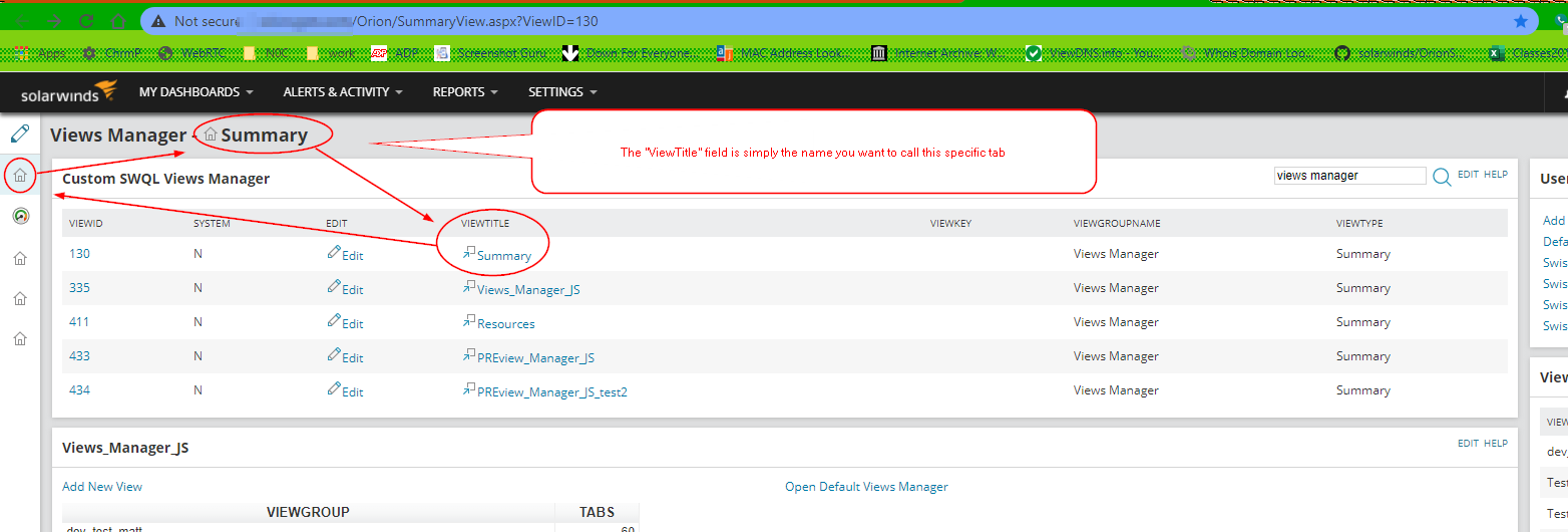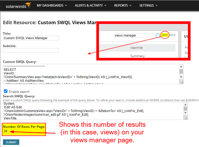 Then, you will need to edit the “Custom Query” resource and copy the contents of the "SWQL_Custom_Views_Manager.txt" file into both sections.