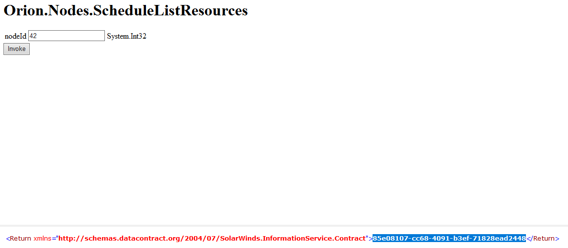 - Post a request to .../Invoke/Orion.Nodes/ScheduleListResources with body { "nodeId": 6 }. A job id is returned. For example "05fd1a93-e069-4a96-a3ad-d82e6affc4a4".