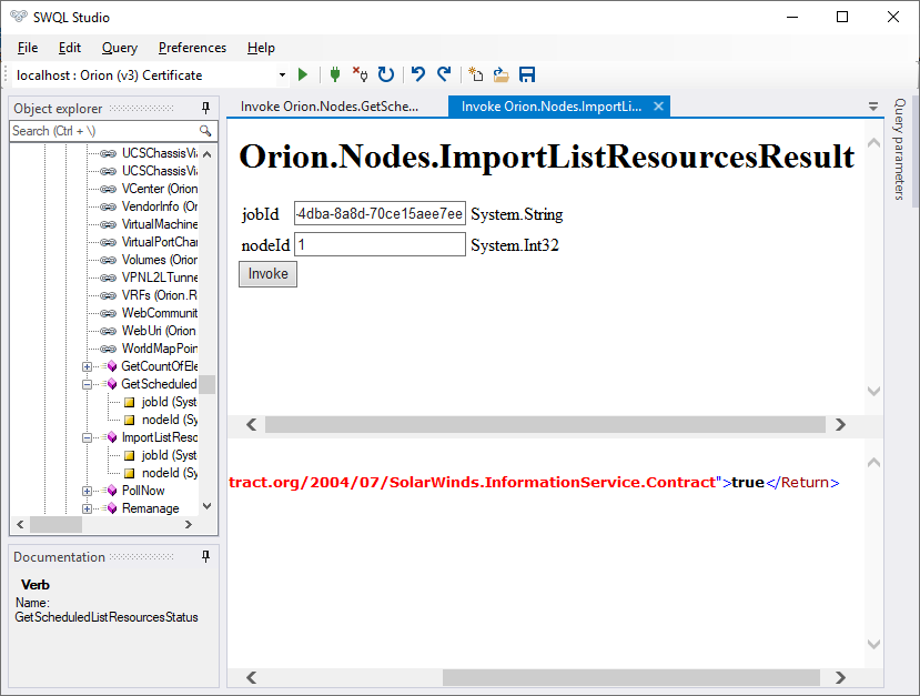 - Post a request to .../Invoke/Orion.Nodes/ImportListResourcesResult with body { "nodeId": 6 , jobId: "05fd1a93-e069-4a96-a3ad-d82e6affc4a4" }. This always returns the aforementioned error.