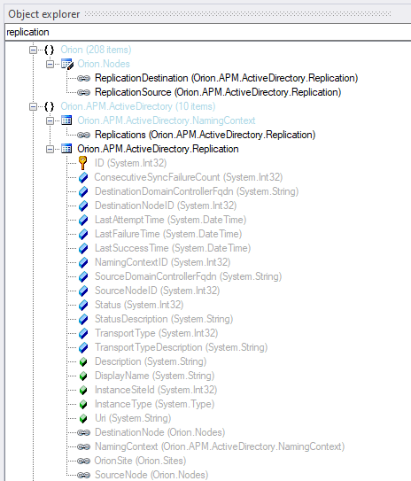 If you are looking to use the table, maybe: SELECT SourceDomainControllerFqdn, DestinationDomainControllerFqdn, ConsecutiveSyncFailureCount, LastFailureTime, LastSuccessTime, LastAttemptTimeFROM Orion.APM.ActiveDirectory.Replication-- Where ConsecutiveSyncFailureCount > 0