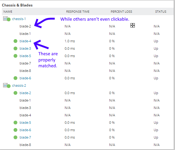 - In our environment at least, it seems that for most of the blades, if Orion doesn't match it to an existing Orion Node then the blade isn't clickable at all. We do have a few blades that aren't matched to nodes that we can click on and it gives us the option to manage, but a vast majority of our blades are not clickable at all, even though in reality most of our blades are populated by ESX hosts in the real world. I just can't figure out how Orion decides whether a blade is clickable. I've seen some suggestions that the fiber interconnect needs to have an external IP set, but that doesn't seem to matter as blades that are attached to FI's with the external IP set seem to have the same amount of trouble being matched to Orion nodes as ones without. I also maybe thought it had something to do with blades having their IP set a certain way, but that doesn't seem to matter either. Some of the blades have IP's recorded in the SolarWinds database and plenty don't, and the ones that do have IP's recorded in the DB aren't matched at a better rate than the ones without