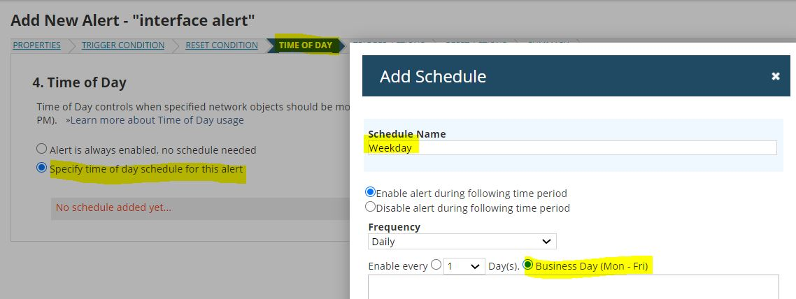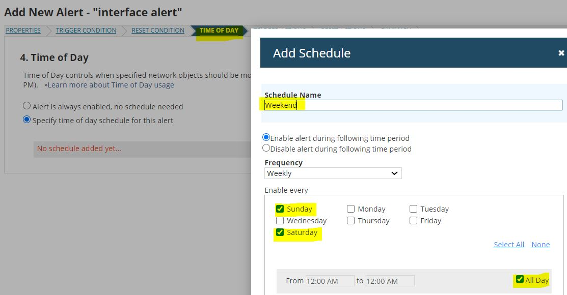 I have a custom property on my interfaces that defines the level on each interface, in different projects we need to change the time for statistics collection but at the weekend we need them to roll back to their pre-defined values (e.g. 1 minute for level 0 and 9 minutes for others), I can define the condition as below