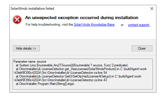 at OrionInstallerLib.LicenseDetector.get_HasLicensedSolarWindsProduct() in C:\buildAgent\work\43ebf6f390c42024\Src\OrionInstallerLib\LicenseDetector.cs:line 54