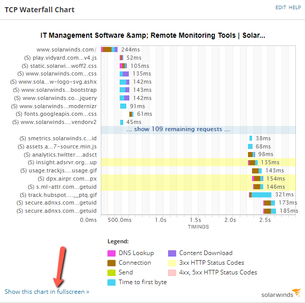 From the Steps Details view locate the TCP Waterfall Chart and click Show this chart in fullscreen.