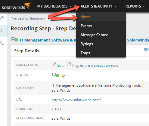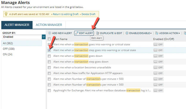 You can search for Transaction using the search function to the right, and locate the alert, Alert me when a transaction step goes into warning or critical state. Select the alert and Edit Alert.