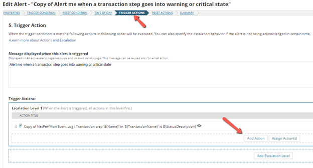 Within the alert, select the Trigger Actions option from the top and then click Add Action.