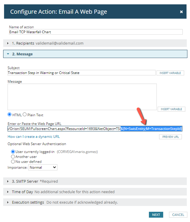 Within the Configure Action view fill out the pertinent information such as Name of Action, Recipients etc. The important piece here is the Enter or Paste the Web Page URL section. Take the URL copied earlier and paste it into this field. We will then modify the URL by removing the number at the end and replacing it with this variable, ${N=SwisEntity;M=TransactionStepId}, so that the URL appears as follows, https://<Orionserver>/Orion/SEUM/FullscreenChart.aspx?ResourceId=1693&NetObject=TS:${N=SwisEntity;M=TransactionStepId}. Again, THIS IS IMPORTANT, the variable is used to reference the ID of the step that is causing the alert to fire.