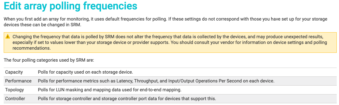 Has anyone dropped the 6 hourly values right down? That first line 'changing the frequency the data is polled by SRM does not alter the frequency the data is collected' is confusing me. SW poll SAN more often but SAN might only poll itself at a fixed speed so more than that is pointless?