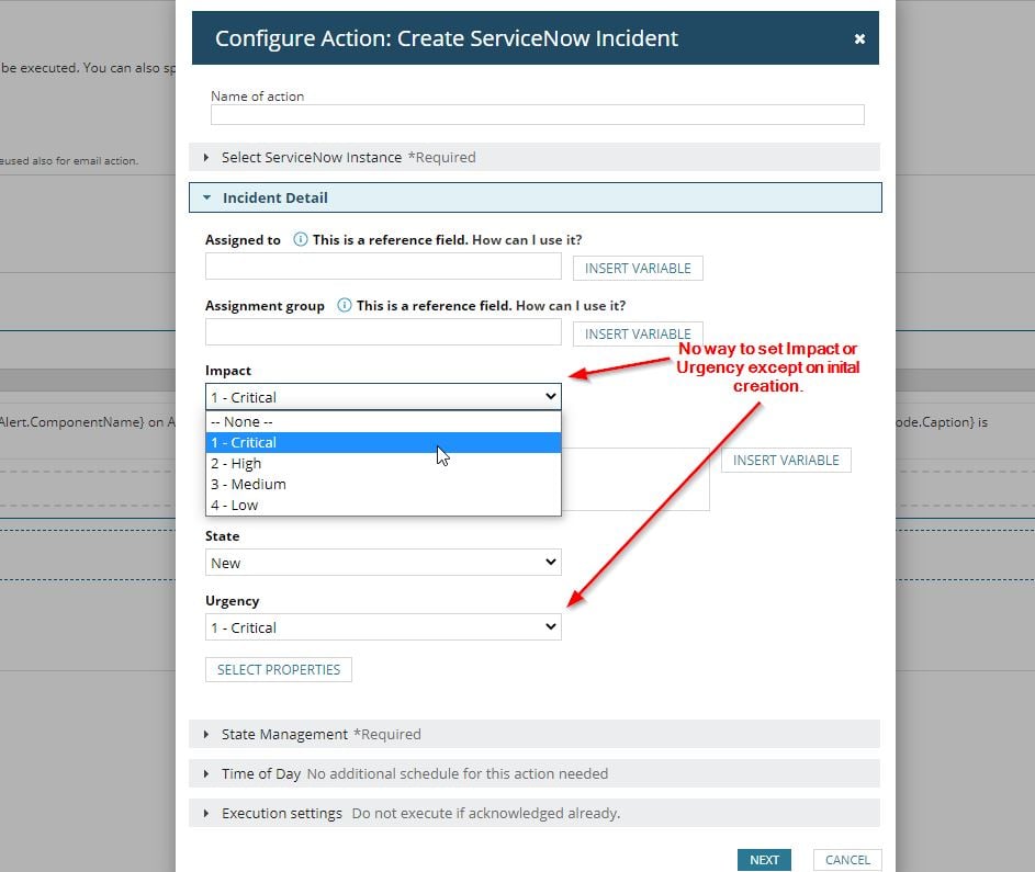 The ServiceNow integration, however, doesn't allow you to specify the criticality based on a variable (it is hard-set by dropdown when you define the action) and incident states also doesn't allow you to change the impact or urgency. Is there a way to set the impact or urgency or both by any kind of variable?
