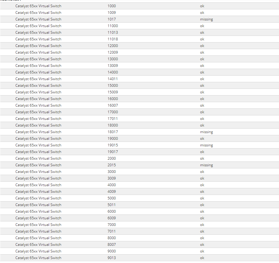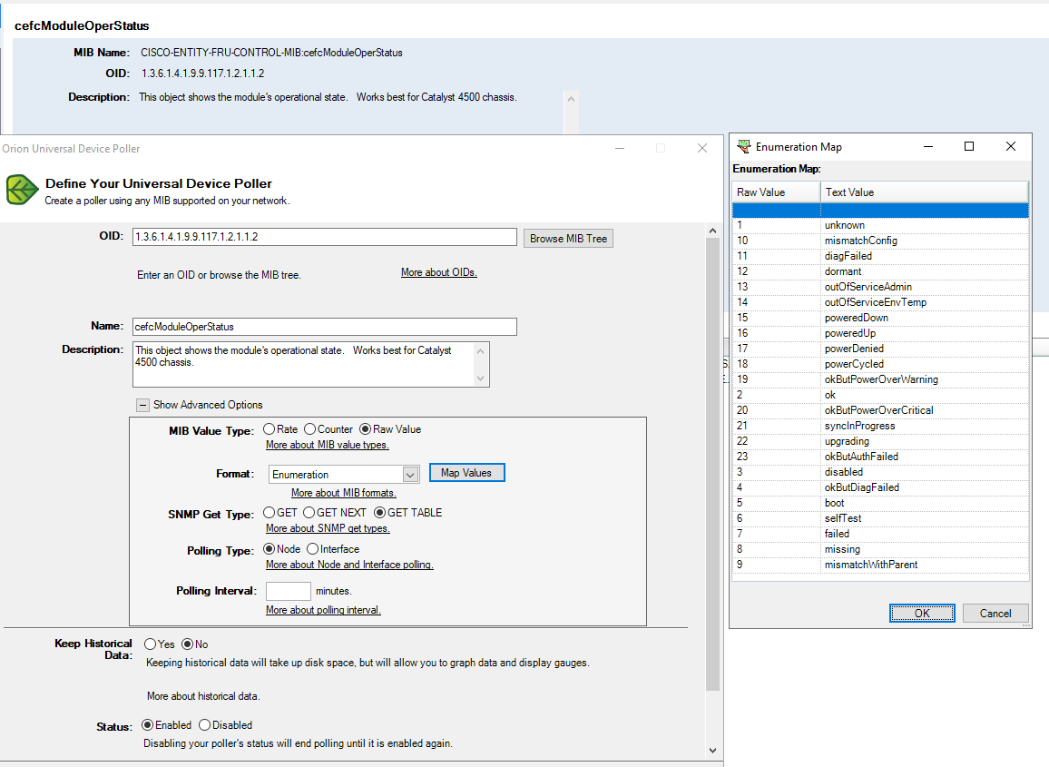 To follow up on this, a 10+ year old post helped out on this 10+ year old hardware, but I have a question: following https://thwack.solarwinds.com/product-forums/network-performance-monitor-npm/f/forum/23547/cisco-linecard-status-poller-and-reports from wbrown, I have imported the UnDP poller for cefcModuleOperStatus and assigned it to my 6509 VSS. The 2 chassis have 9 linecards each, but this poller and report I'm using show way more rows than linecards, and I can't make out exactly how the rows match with what I see on CLI.