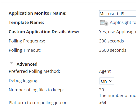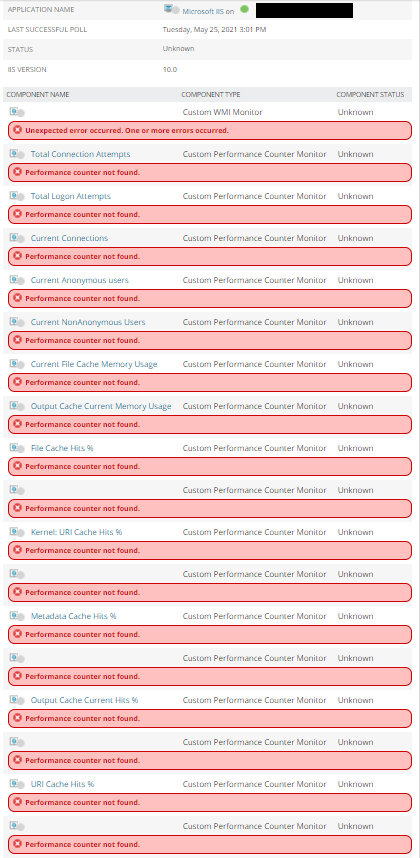 I've been hunting down and resolving issues for Nodes that have been having issues with IIS AppInsight. What I found is some of the Nodes that were showing errors and not providing any information needed a Self Signed certificate and a listener configured manually. Once that was complete I was able to poll via AppInsight for IIS.