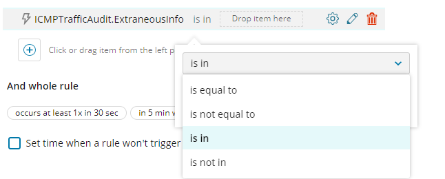 These logs are being fed into SEM and I can see the "Block Malicious IP - OUT" text in the ExtraneousInfo field of ICMPTrafficAudit event types.