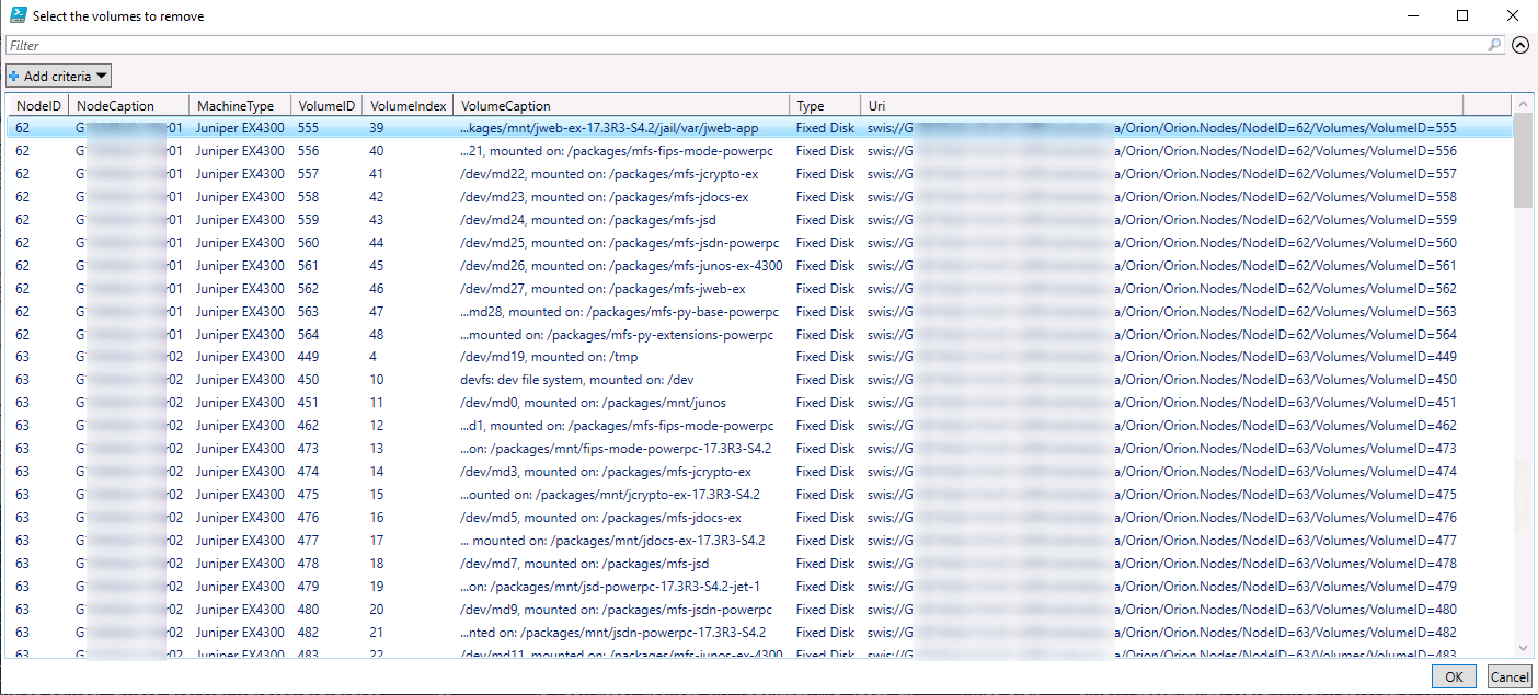 I've built a small PowerShell script to get rid of superfluous volumes that are polluting our Orion environment. Whenever we add Juniper nodes (or use Network Discovery to fix some), a ton of volumes are added. Using this script, I identify all Juniper devices with specific Volume Caption filter (NOT LIKE '%/da0s%').