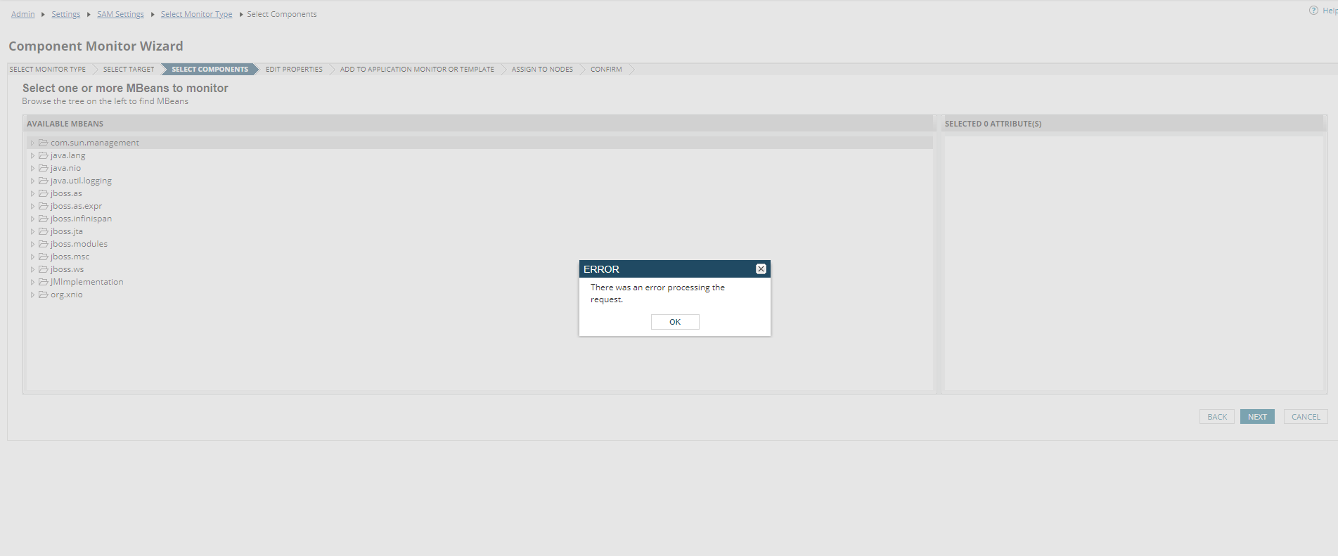 My current issue is, after I select target using Component Monitor Wizard in SAM, I am not able to choose any available Mbeans to monitor, see the screenshot. Could you advice what's the parameters I should use in the .ini file? And Could you also confirm if I need to install Java on the SolarWinds server because I see JRE path is specified in the .ini file, but I don’t really see the path exists on the server.