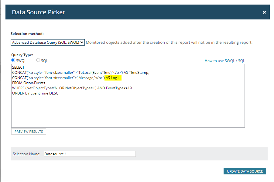 When I paste this exact same query into a Custom Table widget of type SWQL (not SQL) it shows me the CORRECT query results if I hit "preview results" BUT I cannot save the query in the datasource because it says :