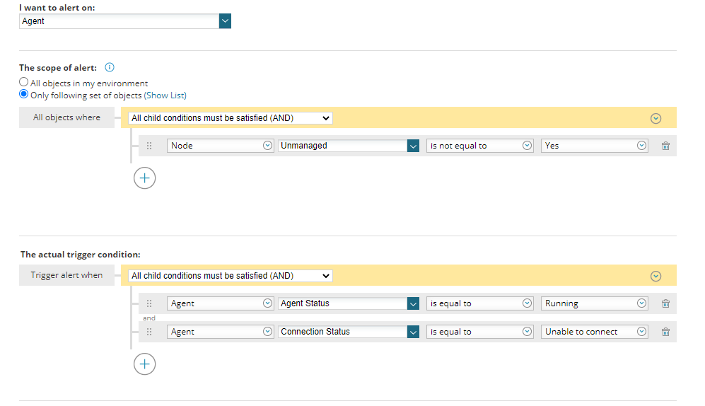 I can create the alert, nodes that are not unmanaged. and only if their agent status is "running" with a connection status of "Unable to connect"