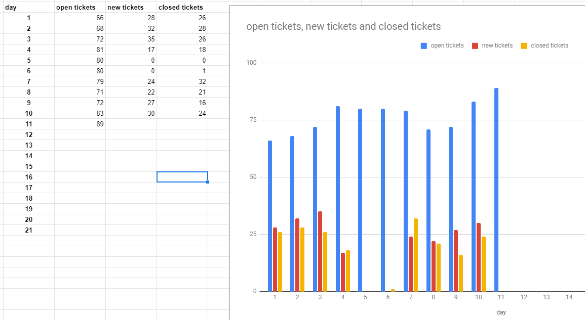 I started with June 1 as an example, where it said we had 94 total open tickets, 28 created, 26, resolved. I understand that total open means tickets that came in from last resolution point + created, so i subtracted how many were created for that day from total open to get a starting point of 66 open tickets at the top of June 1. You can see the data going forward and how, by day 10, it is no where near accurate for today, 6/11. The gray line for the 11th reads 71. I had closed 1 ticket this morning by merging it with another ticket.